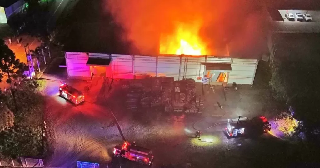 Um incêndio de grandes proporções atingiu um galpão industrial de aproximadamente 1.400 metros quadrados em Jaraguá do Sul, na madrugada deste domingo, 11. O fogo começou pouco antes da meia-noite em um galpão localizado na Servidão 245, no bairro Ilha da Figueira, e mobilizou equipes de bombeiros de quatro cidades. A corporação de Pomerode foi uma das primeiras a chegar ao local e iniciar o combate às chamas.